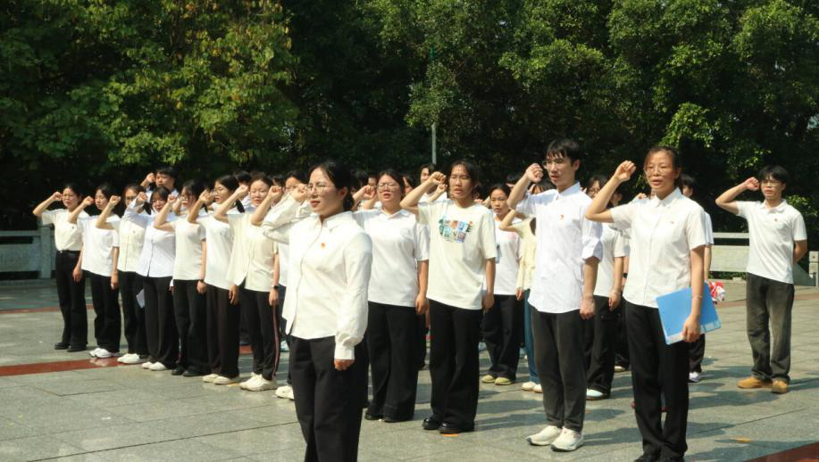活动在庄严的国歌声中拉开帷幕。全体人员向革命英烈肃立默哀、敬献花圈。廖丹婵带领全体党员重温入党誓词,表达坚守初心、牢记使命的坚定决心。随后教师代表以及学生党员代表依次发言,表达对先烈的崇高敬意与深切追思。最后,师生们缓步上前,向革命烈士敬献自制白花,并肃立瞻仰革命烈士纪念碑,在无声缅怀中汲取奋进力量。